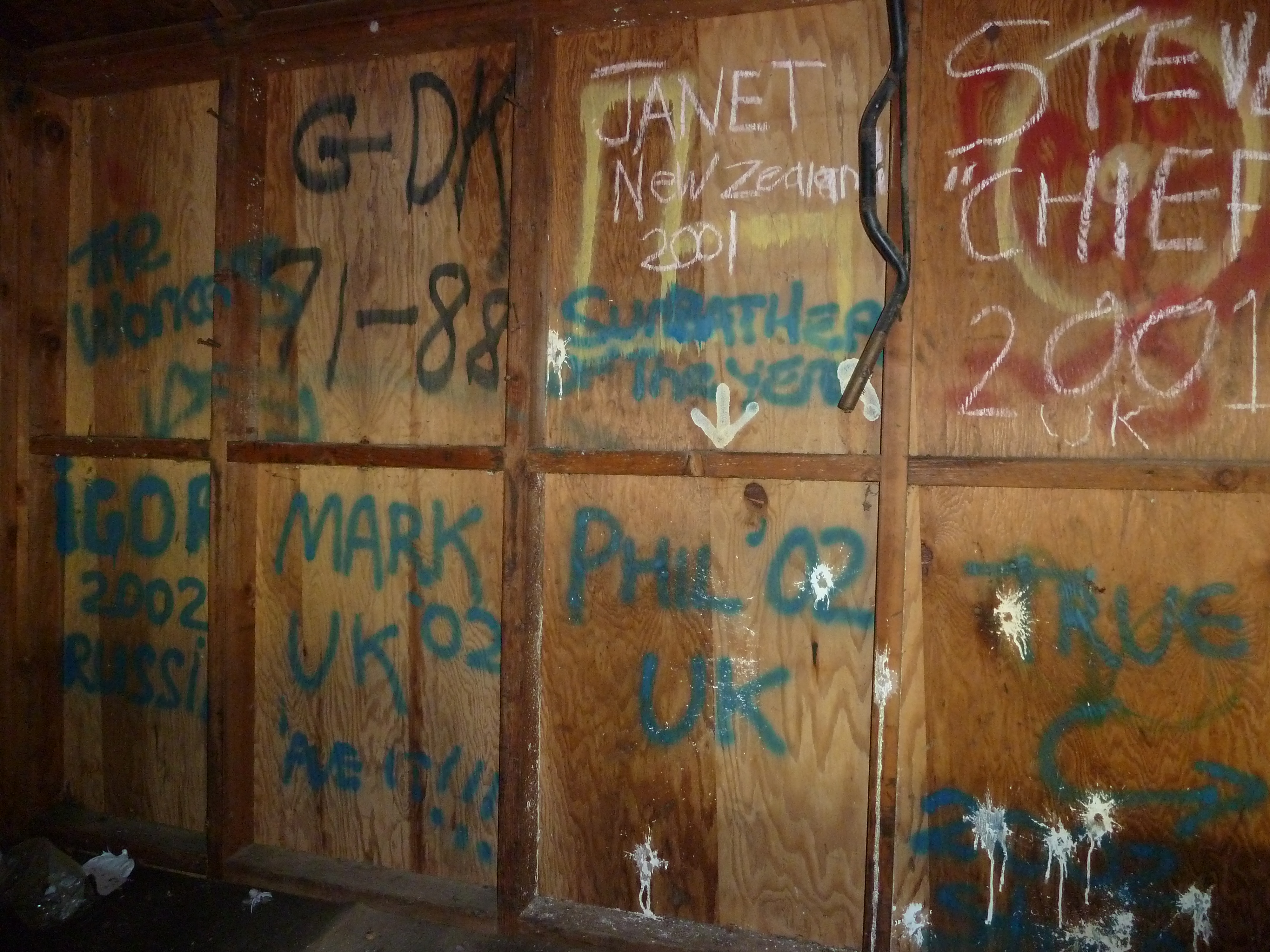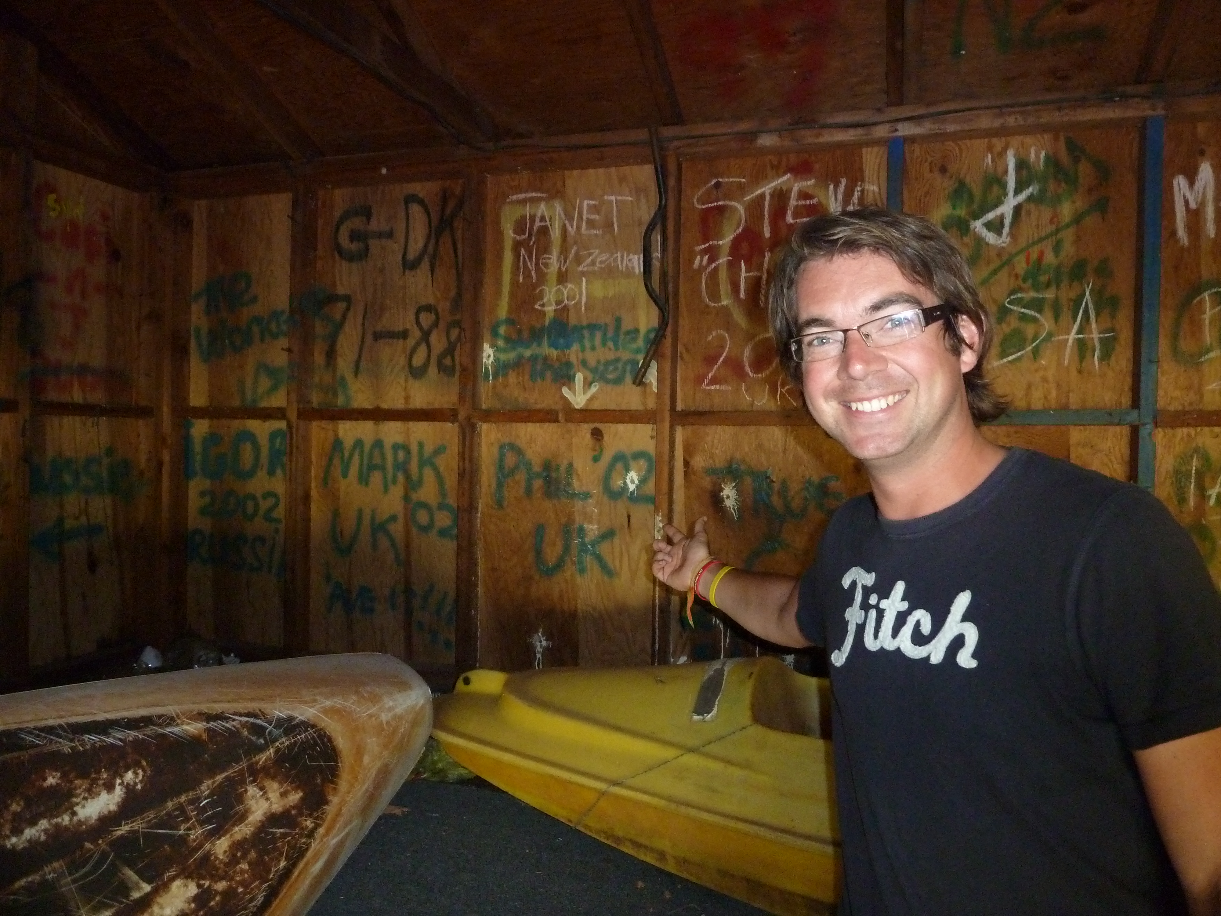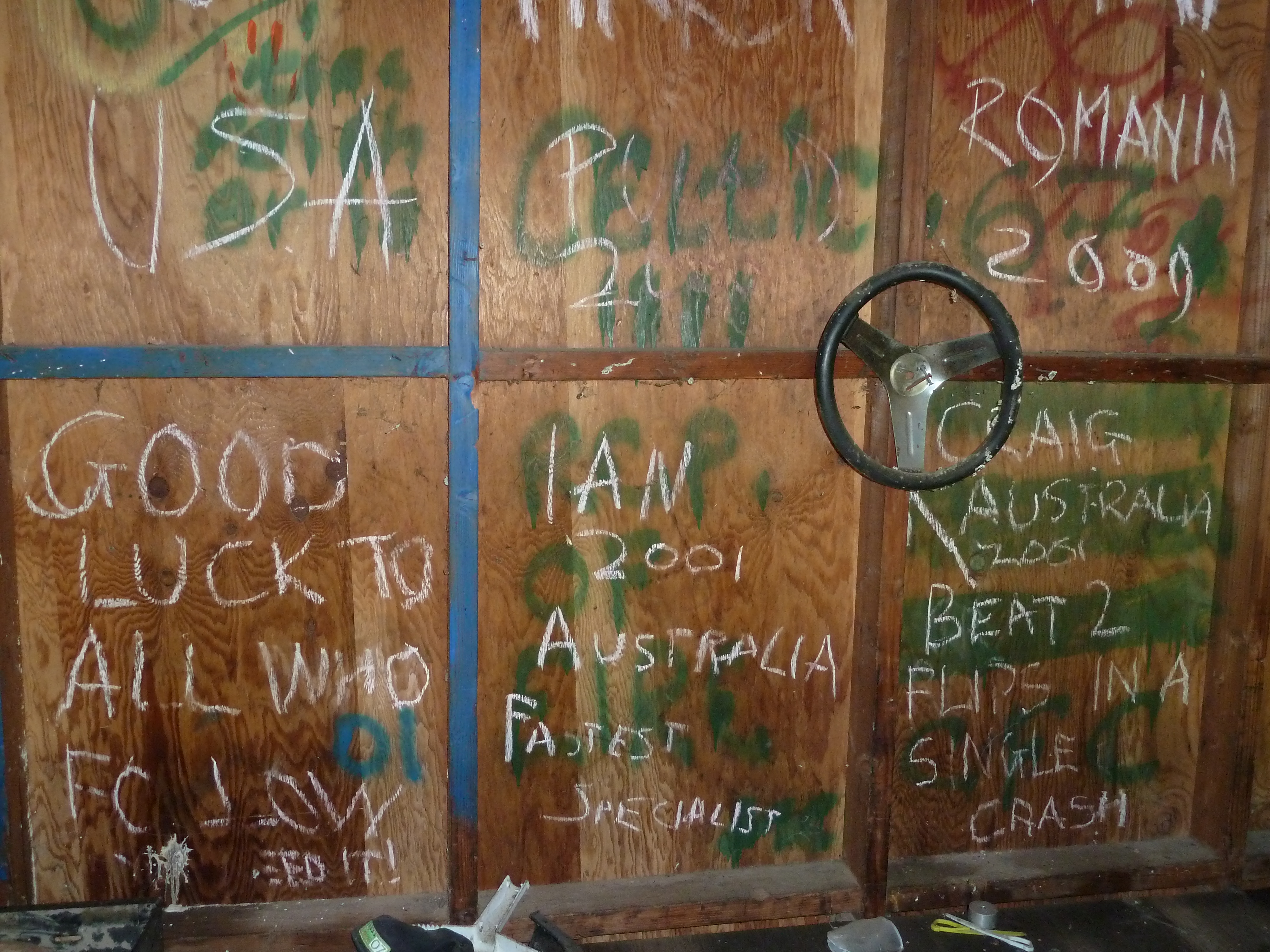 On the wooden walls of the shed, it was customary, as it was in bunks and rooms around the camp, to leave a dated signature behind, a potted history of all who had been before. And there they were, on the back wall – the spray painted signatures that Mark, Igor, Nat and I had left behind on our final day at the track.